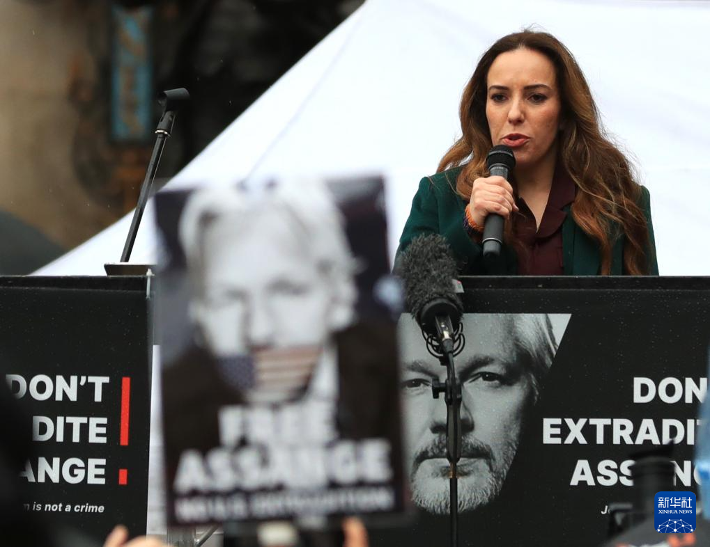 2月21日,在位于伦敦的英国高等法院外,阿桑奇的妻子斯特拉参加集会活动。