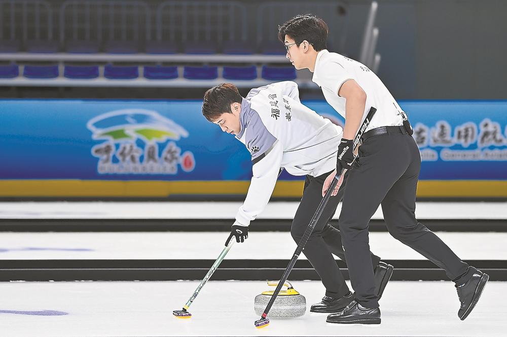 姜东旭(左)和苑明杰在比赛中擦冰。
