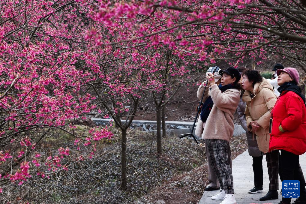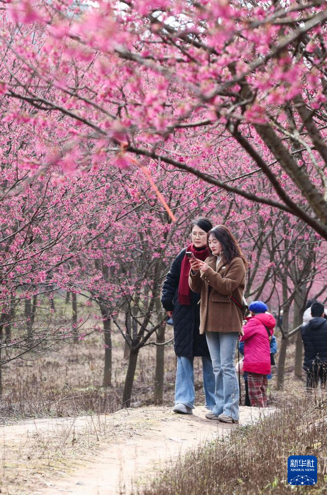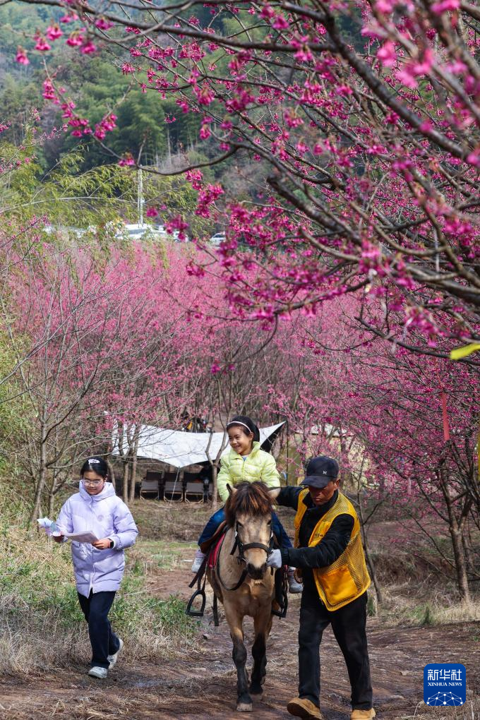 3月2日,游客在米积村樱花林中赏樱。 当日,2024临安樱花旅游月在杭州临安区玲珑街道米积村正式开启。米积村10万株红樱在山间绽放,延绵数公里,构成了一幅如梦如幻的春日画卷,春日雅集、繁花市集、骑马观花、春日祈福等乡村旅游特色活动也与万株樱花一起迎接各地游客。 2012年米积村开始种植中国红垂樱,如今已经形成了近千亩、10万株樱花林。“山深未必得春迟,处处山樱花压枝。”绚烂的樱花林让米积村成为“踏春胜地”,同时带动文旅产业提振升级。 新华社记者 徐昱 摄
