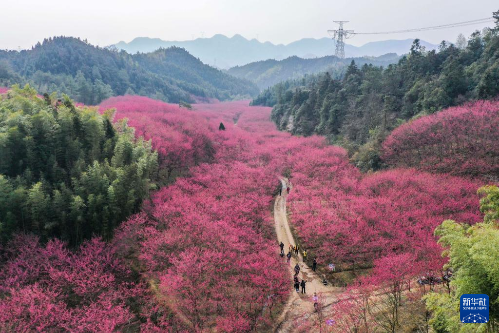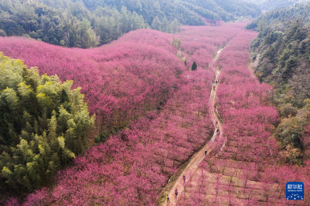 3月2日,游人在樱花林间穿行(无人机照片)。 当日,2024临安樱花旅游月在杭州临安区玲珑街道米积村正式开启。米积村10万株红樱在山间绽放,延绵数公里,构成了一幅如梦如幻的春日画卷,春日雅集、繁花市集、骑马观花、春日祈福等乡村旅游特色活动也与万株樱花一起迎接各地游客。 2012年米积村开始种植中国红垂樱,如今已经形成了近千亩、10万株樱花林。“山深未必得春迟,处处山樱花压枝。”绚烂的樱花林让米积村成为“踏春胜地”,同时带动文旅产业提振升级。 新华社记者 徐昱 摄