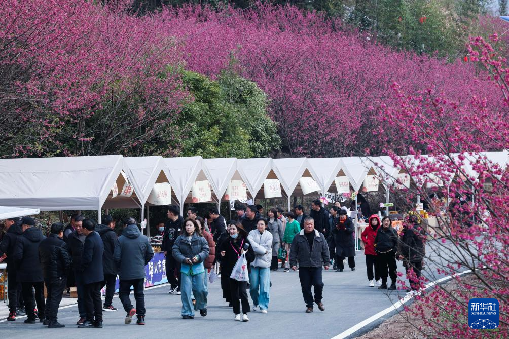 3月2日,游客在米积村樱花林中的繁花市集游览。 当日,2024临安樱花旅游月在杭州临安区玲珑街道米积村正式开启。米积村10万株红樱在山间绽放,延绵数公里,构成了一幅如梦如幻的春日画卷,春日雅集、繁花市集、骑马观花、春日祈福等乡村旅游特色活动也与万株樱花一起迎接各地游客。 2012年米积村开始种植中国红垂樱,如今已经形成了近千亩、10万株樱花林。“山深未必得春迟,处处山樱花压枝。”绚烂的樱花林让米积村成为“踏春胜地”,同时带动文旅产业提振升级。 新华社记者 徐昱 摄