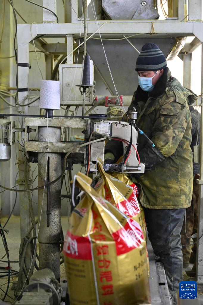 3月1日,在铁岭县辽宁东北丰专用肥有限公司,工作人员在给化肥包装封袋。 近日,辽宁省铁岭县积极开展春耕备耕物资的运输、生产及对农民培训工作,为新一年的农业生产打好基础。 新华社记者 杨青 摄