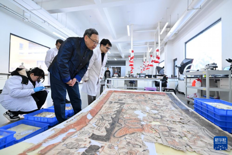 在云冈研究院壁画文物修复室,杭侃(前)和同事交流壁画修复方案(2024年2月25日摄)。新华社记者 詹彦 摄