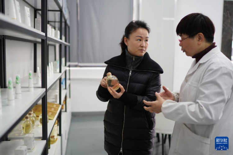 明经华(左)在位于江西赣州市章贡区的赣州哈克生物科技有限公司调研油茶深加工产业(2023年2月24日摄)。新华社记者 周密 摄