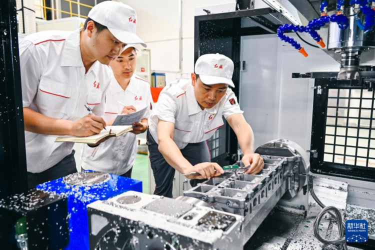 杨永修(右)在中国一汽研发总院加工车间内检查试制零部件的精度(2023年6月8日摄)。新华社记者 许畅 摄