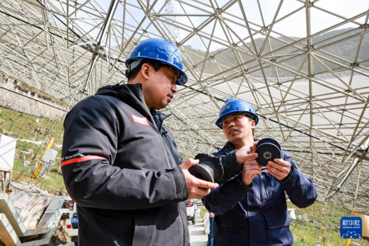 姜鹏(左)在贵州“中国天眼”的反射面板下与工作人员交谈(2023年2月13日维护保养期间拍摄)。新华社记者 欧东衢 摄