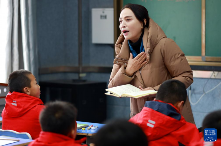 董彩云在甘肃省临夏州东乡县布楞沟石化小学调研(2024年2月6日摄)。新华社记者 郭刚 摄