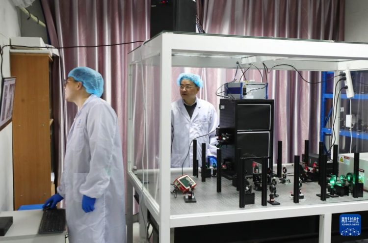 研究团队在上海光机所光学实验室,利用国际首创的双光束调控聚集诱导发光超分辨光存储技术做写入试验(2月29日摄)。