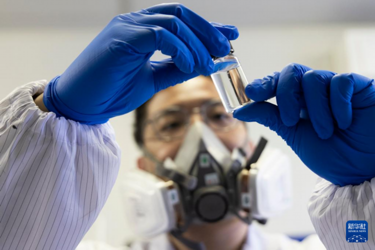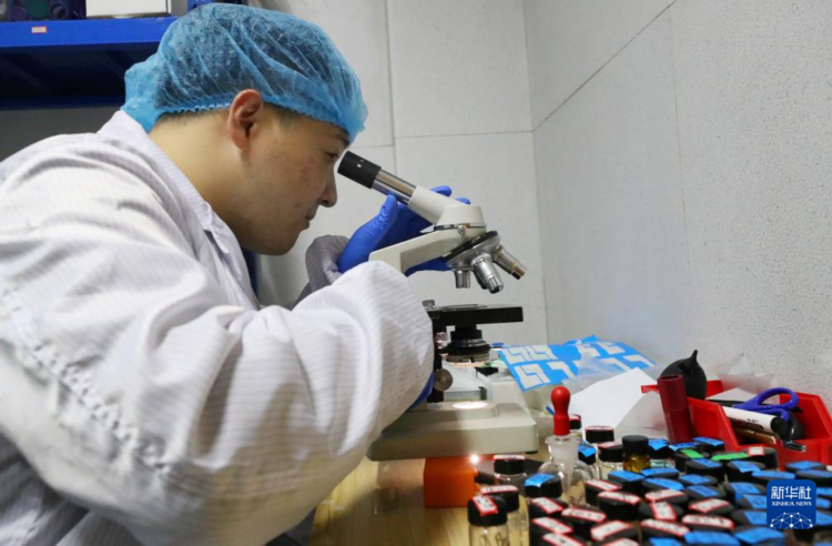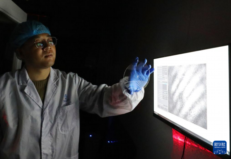 赵苗博士在上海光机所材料实验室内观察实验材料(2月29日摄)。