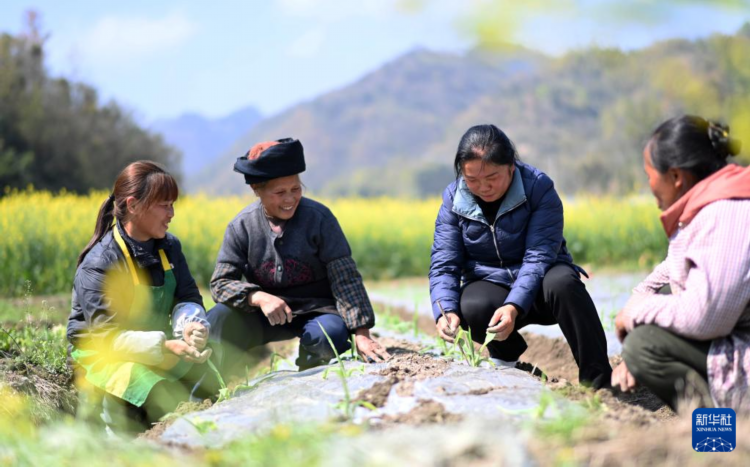 3月4日,技术人员(右二)在罗甸县逢亭镇粤港澳大湾区蔬菜保供基地指导村民种鲜食玉米。 初春时节,在贵州省黔南布依族苗族自治州罗甸县逢亭镇粤港澳大湾区蔬菜保供基地,村民们开展育苗、栽种、管护、施肥等农事活动,一派早春人勤的繁忙景象。 新华社记者 杨楹 摄