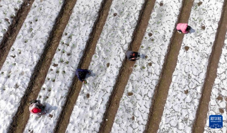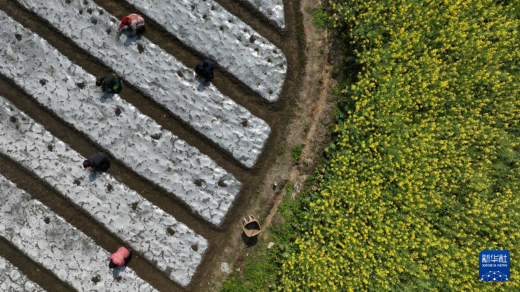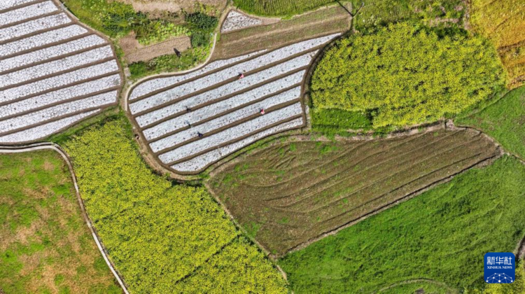 3月4日,村民在罗甸县逢亭镇粤港澳大湾区蔬菜保供基地劳作(无人机照片)。 初春时节,在贵州省黔南布依族苗族自治州罗甸县逢亭镇粤港澳大湾区蔬菜保供基地,村民们开展育苗、栽种、管护、施肥等农事活动,一派早春人勤的繁忙景象。 新华社发(张良静 摄)