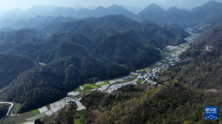 3月4日拍摄的罗甸县逢亭镇粤港澳大湾区蔬菜保供基地(无人机照片)。 初春时节,在贵州省黔南布依族苗族自治州罗甸县逢亭镇粤港澳大湾区蔬菜保供基地,村民们开展育苗、栽种、管护、施肥等农事活动,一派早春人勤的繁忙景象。 新华社记者 杨楹 摄