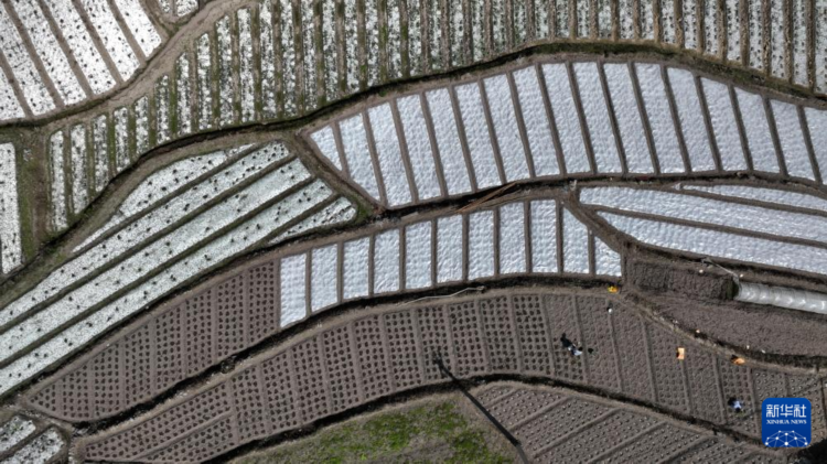 3月4日,村民在罗甸县逢亭镇粤港澳大湾区蔬菜保供基地劳作(无人机照片)。 初春时节,在贵州省黔南布依族苗族自治州罗甸县逢亭镇粤港澳大湾区蔬菜保供基地,村民们开展育苗、栽种、管护、施肥等农事活动,一派早春人勤的繁忙景象。 新华社记者 杨楹 摄
