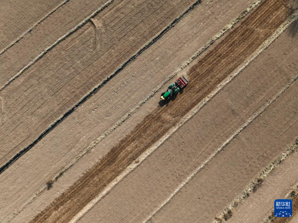 3月7日,青海省海东市民和回族土族自治县中川乡光明村村民在耕地播种(无人机照片)。 近日,随着气温转暖,各地陆续进入春耕时节,田间地头一片忙碌景象。 新华社记者 张龙 摄pagebreak
