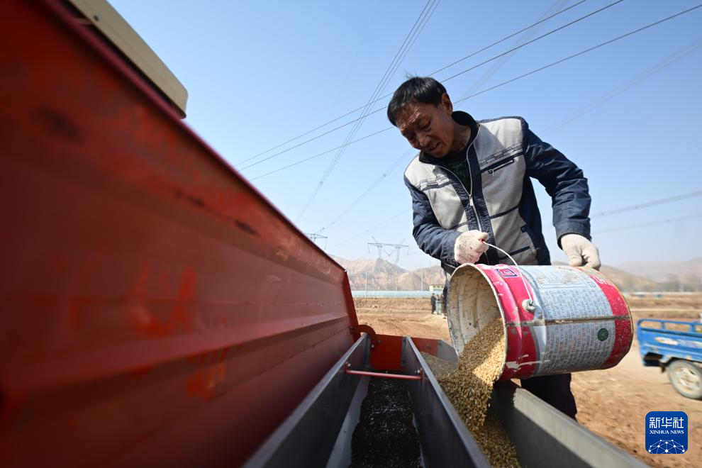 3月7日,青海省海东市民和回族土族自治县中川乡光明村村民往播种机内撒种。 近日,随着气温转暖,各地陆续进入春耕时节,田间地头一片忙碌景象。 新华社记者 周盛盛 摄pagebreak