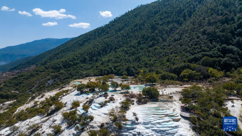 3月10日在香格里拉市三坝乡拍摄的白水台一景(无人机照片)。 白水台位于云南省迪庆藏族自治州香格里拉市三坝乡,海拔2380米,面积约3平方公里。由于碳酸钙溶解于泉水,形成了白水台如今的自然奇观,被称为“白云遗落在人间的地方”。 新华社记者 胡超 摄pagebreak