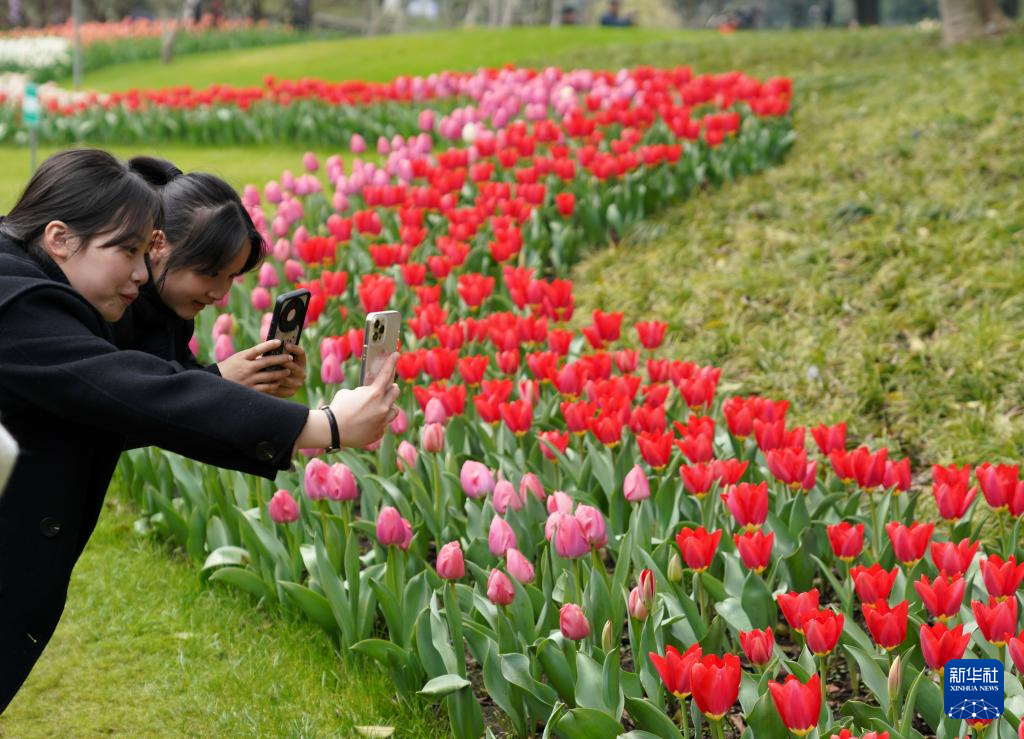 3月11日,两名游客在杭州太子湾公园拍摄郁金香。 近期,杭州太子湾公园里的郁金香早花品种已陆续开放,吸引市民、游客前来观赏。 新华社记者 韩传号 摄pagebreak