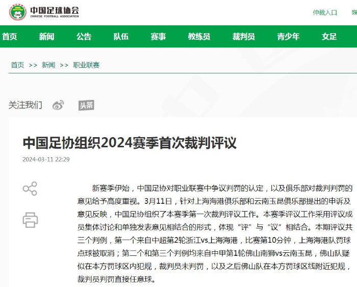 新华社北京3月11日电 中国足协11日召开2024赛季第一次裁判评议会议,对上海海港队和云南玉昆队提出申诉或意见反馈的3个争议判罚进行评议,并在官网公布评议结果。