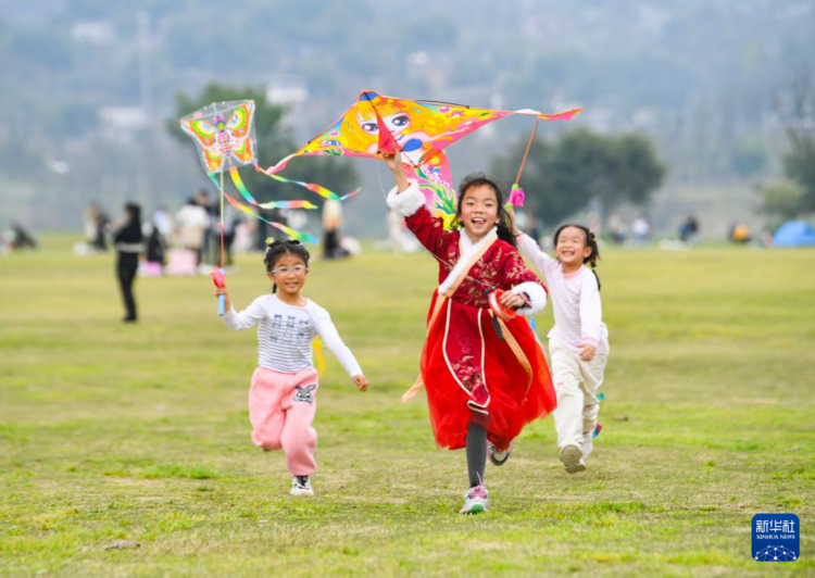 3月16日,小朋友在重庆广阳岛东岛头放风筝。新华社记者 王全超 摄