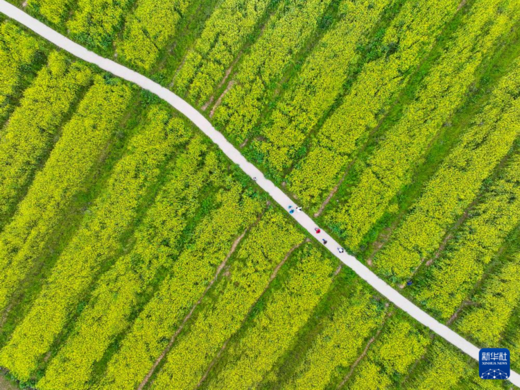 3月16日,游客在重庆广阳岛油菜花田游览(无人机照片)。新华社记者 王全超 摄