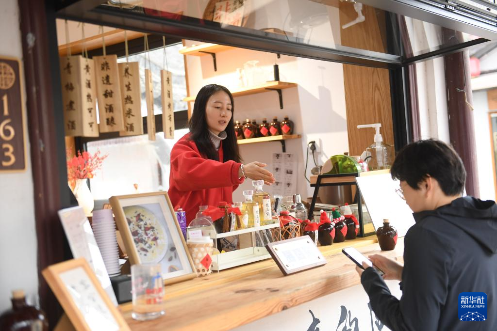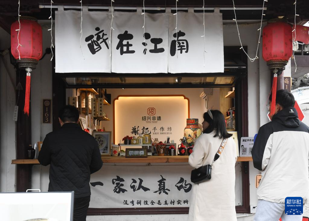 2月20日,游客在绍兴市越城区仓桥直街一家经营黄酒创意饮品的店铺消费。 近年来,在黄酒主产区浙江绍兴,黄酒产业在保留纯手工酿制技艺的基础上,开始向智能化生产迈进,逐步实现酿造智能化、储存智慧化、勾调数字化、物流无人化。与此同时,结合国潮,越来越多终端店铺推出黄酒奶茶、黄酒咖啡、黄酒布丁等创意饮品、美食,消费场景和包装愈发年轻态。 2023年绍兴市规上黄酒生产企业的总营收和利润实现双增长,黄酒衍生品也成为古城旅游消费的一大热点。 新华社记者 翁忻旸 摄pagebreak
