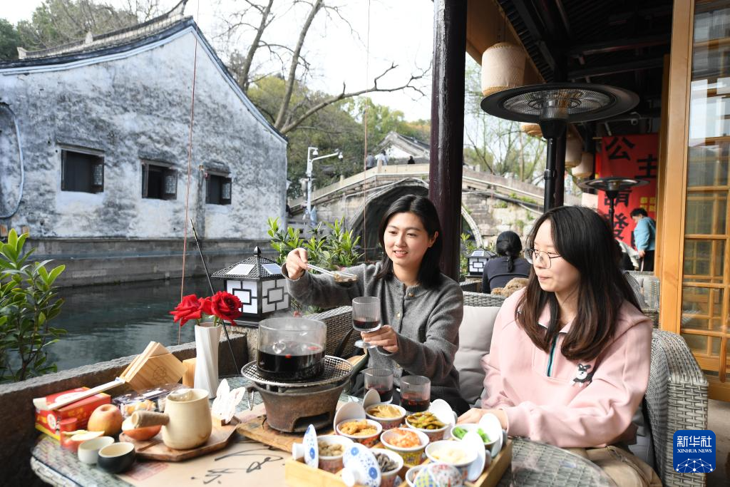 3月13日,人们在绍兴市越城区仓桥直街的一家店铺体验“围炉煮酒”。 近年来,在黄酒主产区浙江绍兴,黄酒产业在保留纯手工酿制技艺的基础上,开始向智能化生产迈进,逐步实现酿造智能化、储存智慧化、勾调数字化、物流无人化。与此同时,结合国潮,越来越多终端店铺推出黄酒奶茶、黄酒咖啡、黄酒布丁等创意饮品、美食,消费场景和包装愈发年轻态。 2023年绍兴市规上黄酒生产企业的总营收和利润实现双增长,黄酒衍生品也成为古城旅游消费的一大热点。 新华社记者 翁忻旸 摄pagebreak