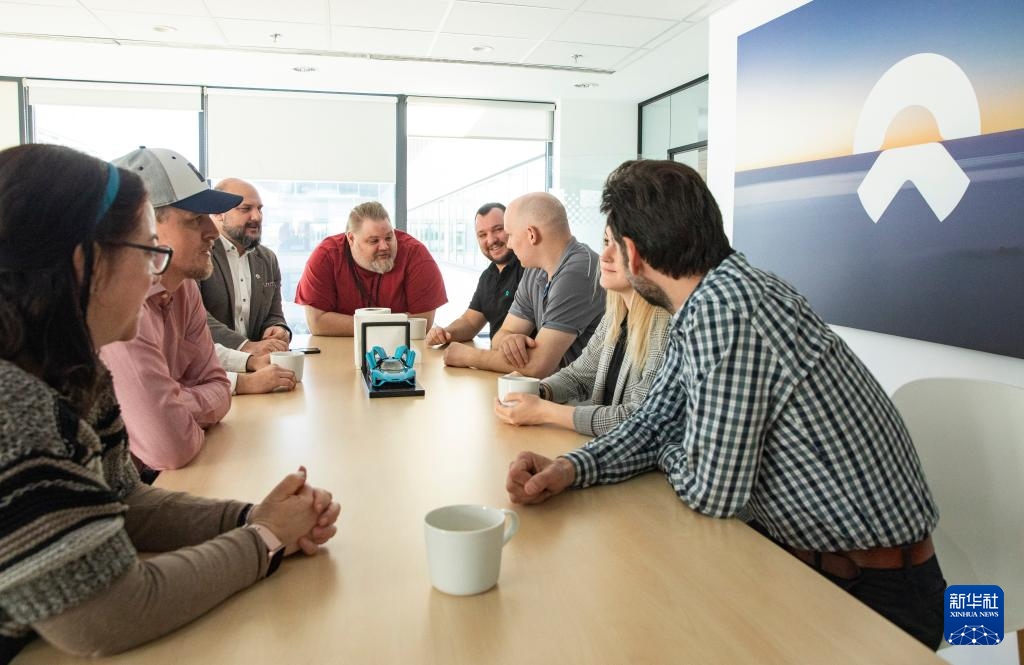 3月18日,在匈牙利布达佩斯,员工在蔚来商业服务中心开工作会议。 位于匈牙利布达佩斯的蔚来商业服务中心(BSC)成立于2022年,拥有来自欧洲多国的50多名员工。蔚来商业服务中心的核心功能涵盖欧洲范围内的客户支持、财务、人力资源和信息技术解决方案等方面,为欧洲客户提供全天候的服务。 新华社记者 张帆 摄