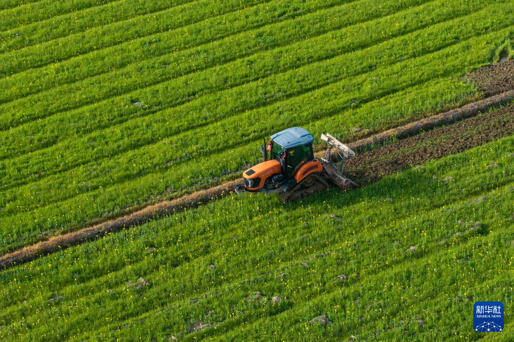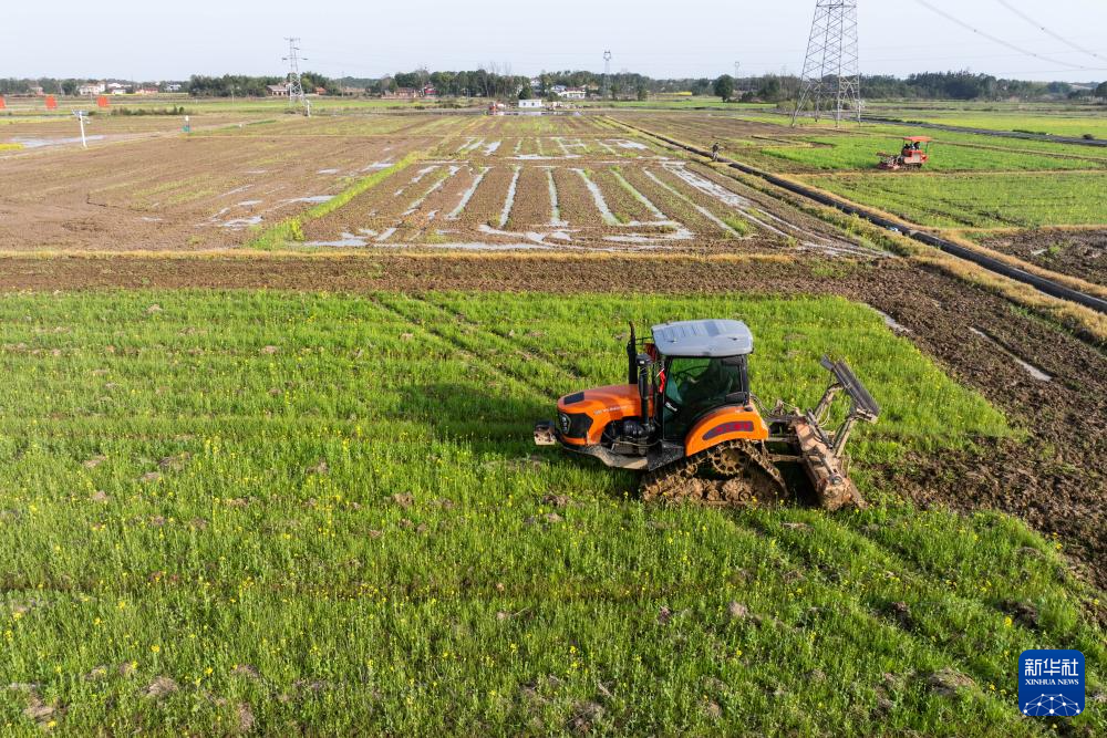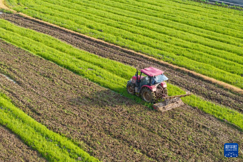 3月19日,在谢家铺镇港中坪村,村民驾驶农机翻耕田地(无人机照片)。