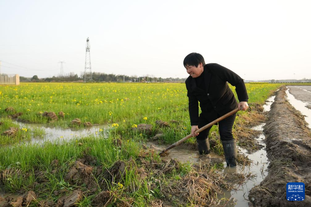 3月19日,在谢家铺镇港中坪村,村民在疏通田间的水渠。