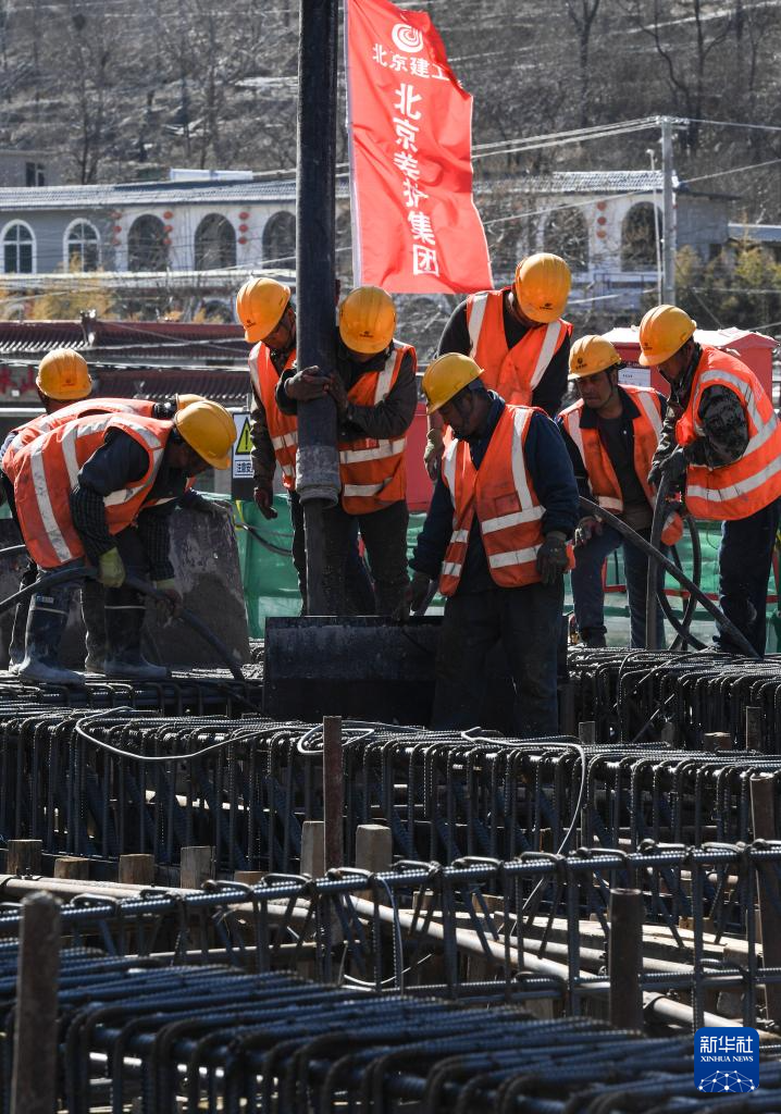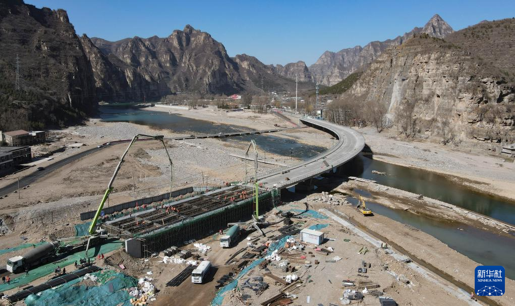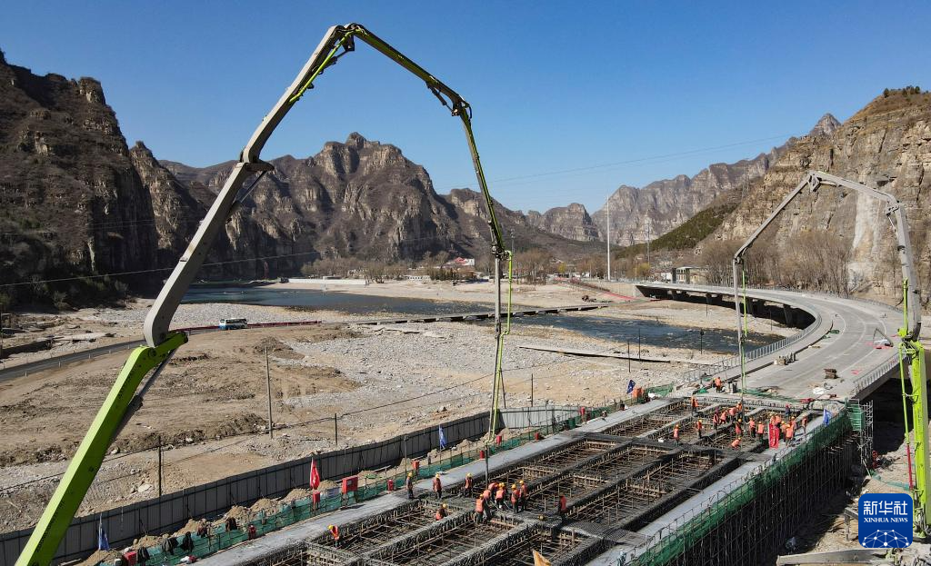 3月20日,工人们在十渡镇六渡桥进行箱梁浇筑施工。