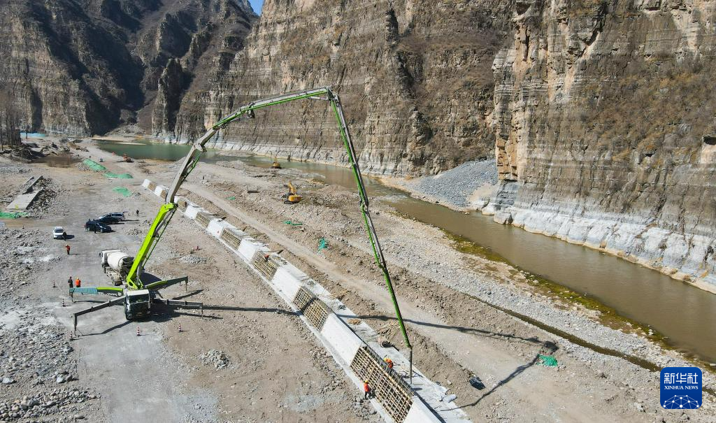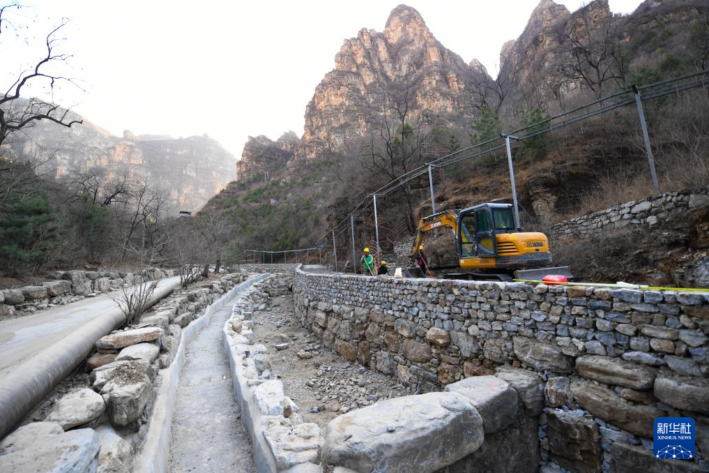 这是3月20日拍摄的位于十渡镇西河村和前头港村交界处的拒马河水毁修复工程(无人机照片)。