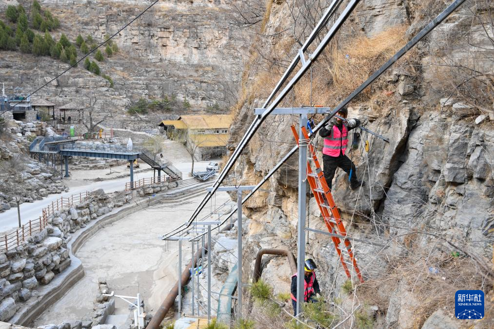 3月20日,工人在乐谷银滩景区漂流沟道旁的路面进行施工。