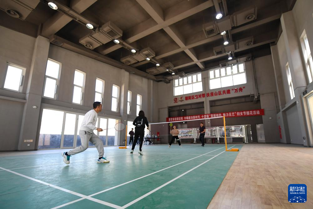 3月20日,村民在十渡应急保障中心打羽毛球。该中心为平急两用房,平时作为社区服务中心,急时作为应急保障中心。