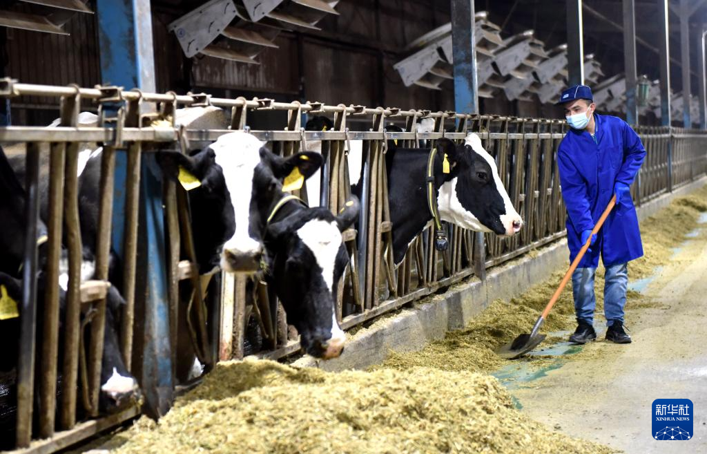 3月24日,威县君乐宝乳业有限公司第一牧场饲养员在牛舍给奶牛喂料。