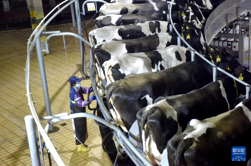 3月24日,工作人员在威县君乐宝乳业有限公司挤奶大厅工作。