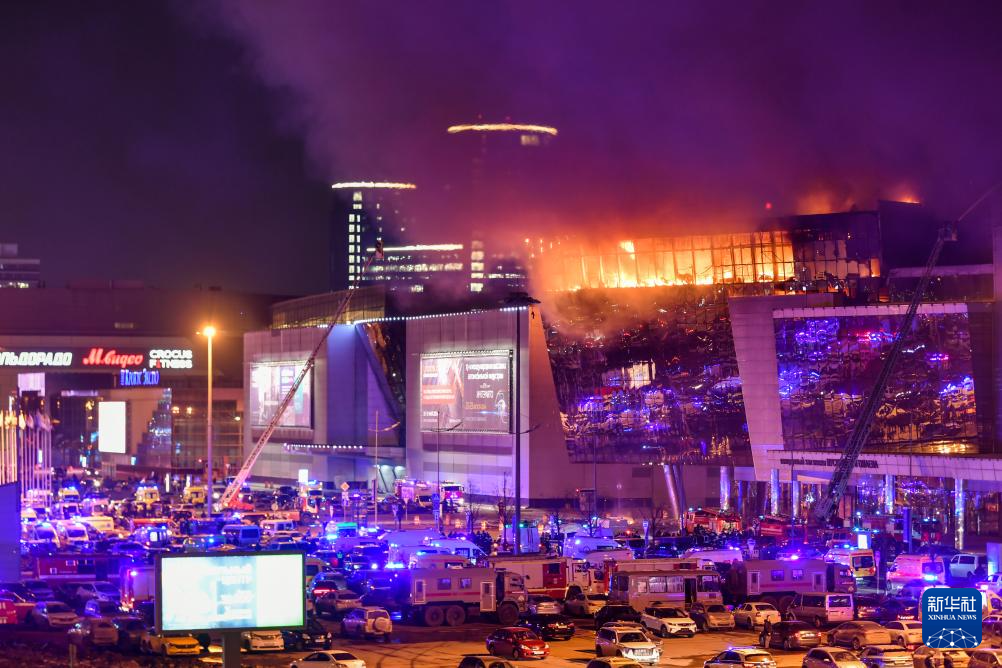 3月22日,俄罗斯莫斯科近郊克拉斯诺戈尔斯克市一音乐厅发生枪击事件后引发火灾。