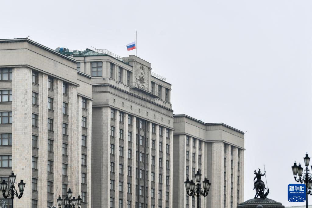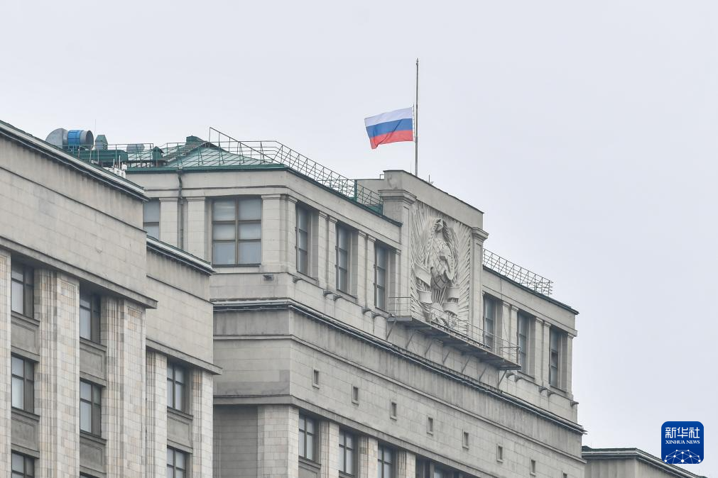 3月24日,在俄罗斯莫斯科,俄国家杜马大楼降半旗。 俄罗斯首都莫斯科近郊一家音乐厅22日晚发生严重恐怖袭击事件。俄总统普京宣布3月24日为全国哀悼日。 新华社记者 曹阳 摄