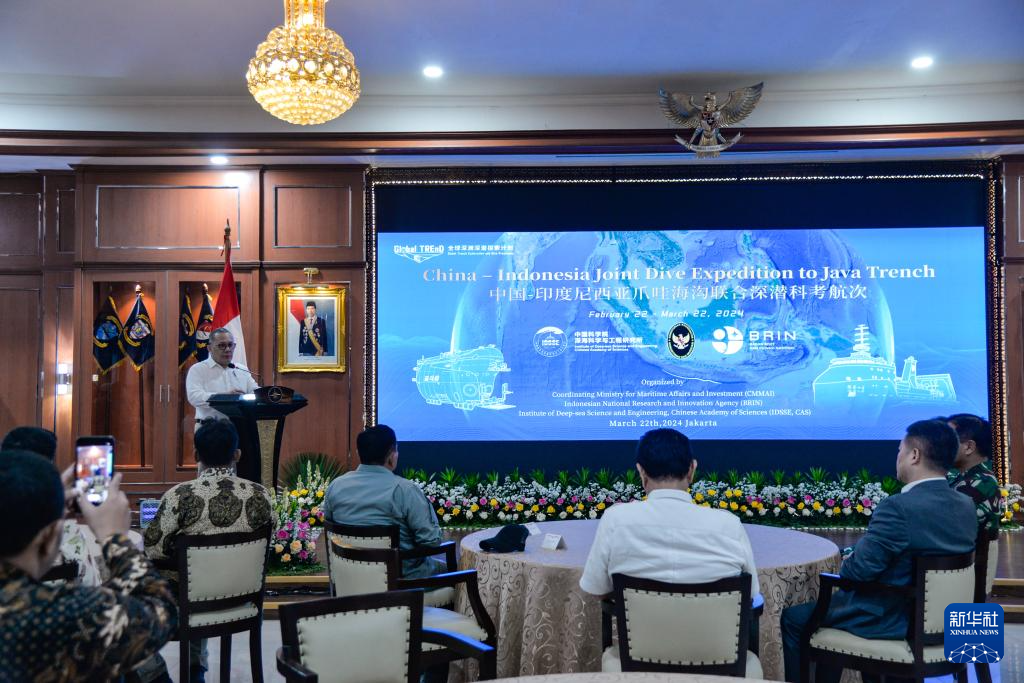 3月22日,在印度尼西亚雅加达丹戎不碌港,印尼国家研究创新署署长汉多科在“中印尼爪哇海沟联合科考”庆祝仪式上致辞。