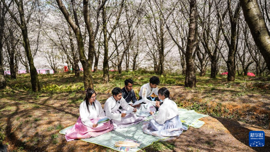 3月25日,留学生在贵州省贵安新区樱花园游玩。