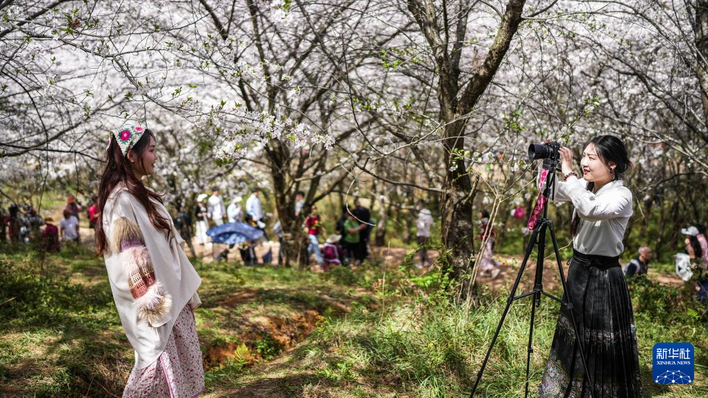 3月25日,游客在贵州省贵安新区樱花园拍照留念。