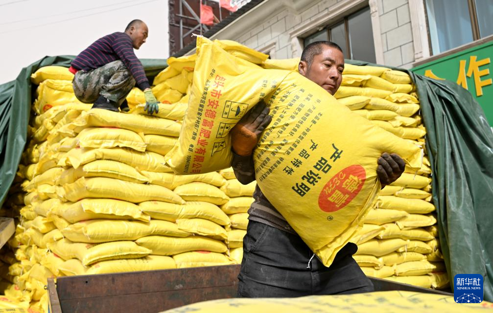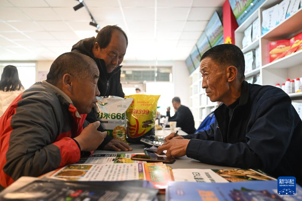 3月27日,村民(前左)在内蒙古呼和浩特市土默特左旗敕勒川镇只几梁村年年有余农业发展有限公司咨询购买农资。