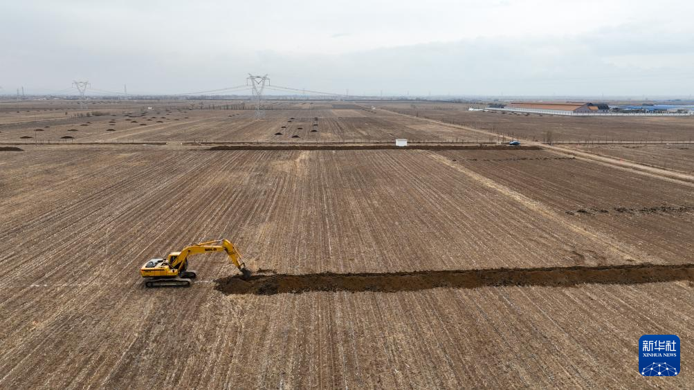 3月27日,工人驾驶挖掘机在内蒙古呼和浩特市赛罕区金河镇碾格图村一处高标准农田建设现场施工(无人机照片)。