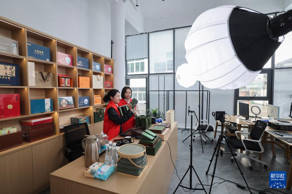 3月27日,在杭州市富阳区银湖街道唐家坞村的共富工坊内,党员志愿者进行春茶直播销售。