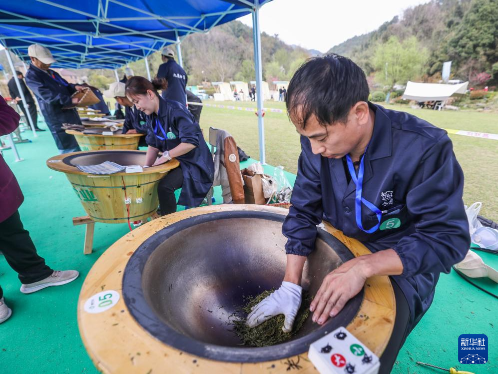 3月27日,茶农参加在杭州富阳银湖街道坑西村举行的春茶手工炒茶大赛。