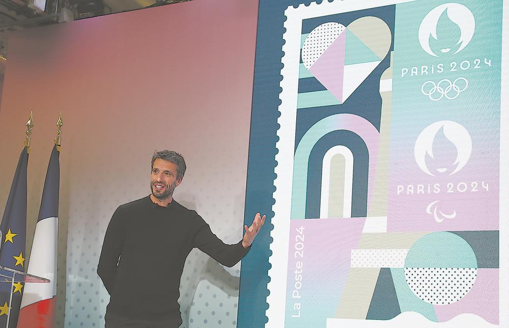 26日,巴黎奥组委主席托尼·埃斯坦盖在发布会上介绍巴黎奥运会及残奥会官方邮票。新华社