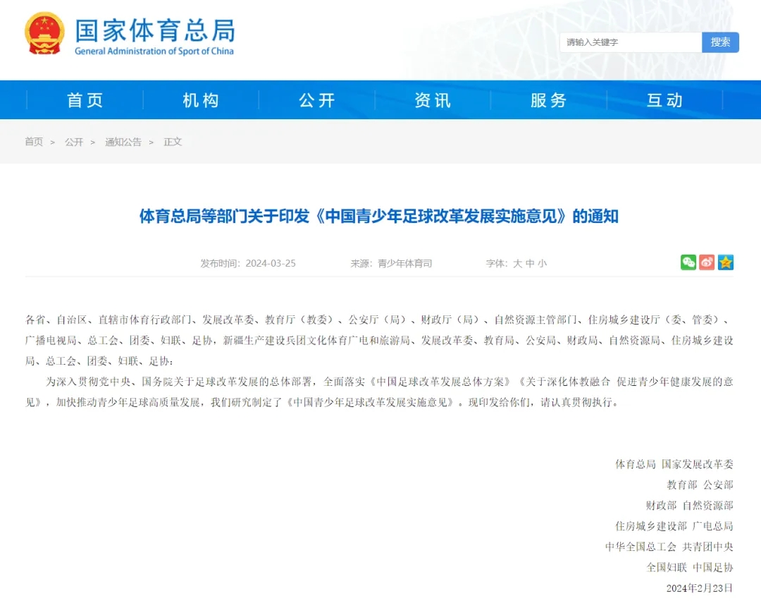 近日,体育总局、国家发展改革委、教育部、公安部、财政部、自然资源部、住房城乡建设部、广电总局、中华全国总工会、共青团中央、全国妇联、中国足协等部门联合印发《中国青少年足球改革发展实施意见》。