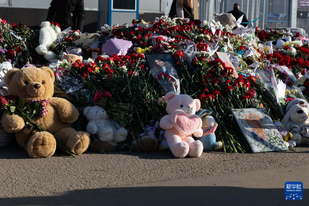 这是3月28日在俄罗斯首都莫斯科近郊“克罗库斯城”音乐厅前拍摄的鲜花和玩具。 俄罗斯紧急情况部27日发布消息说,莫斯科近郊音乐厅恐袭事件遇难者人数升至143人。 新华社记者 白雪骐 摄