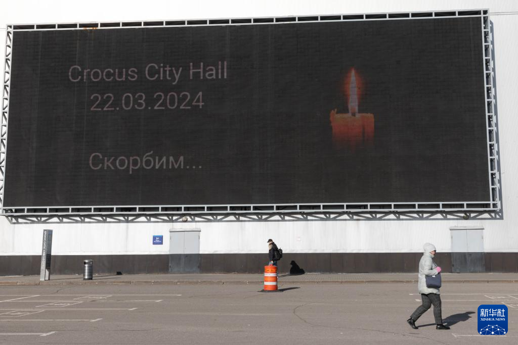 3月28日,在俄罗斯莫斯科近郊“克罗库斯城”音乐厅附近,行人经过悼念遇难者的显示屏。 俄罗斯紧急情况部27日发布消息说,莫斯科近郊音乐厅恐袭事件遇难者人数升至143人。 新华社记者 白雪骐 摄