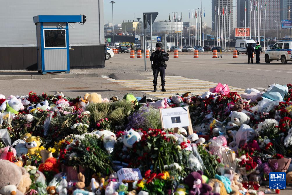 3月28日,警察在俄罗斯莫斯科近郊“克罗库斯城”音乐厅附近执勤。 俄罗斯紧急情况部27日发布消息说,莫斯科近郊音乐厅恐袭事件遇难者人数升至143人。 新华社记者 白雪骐 摄