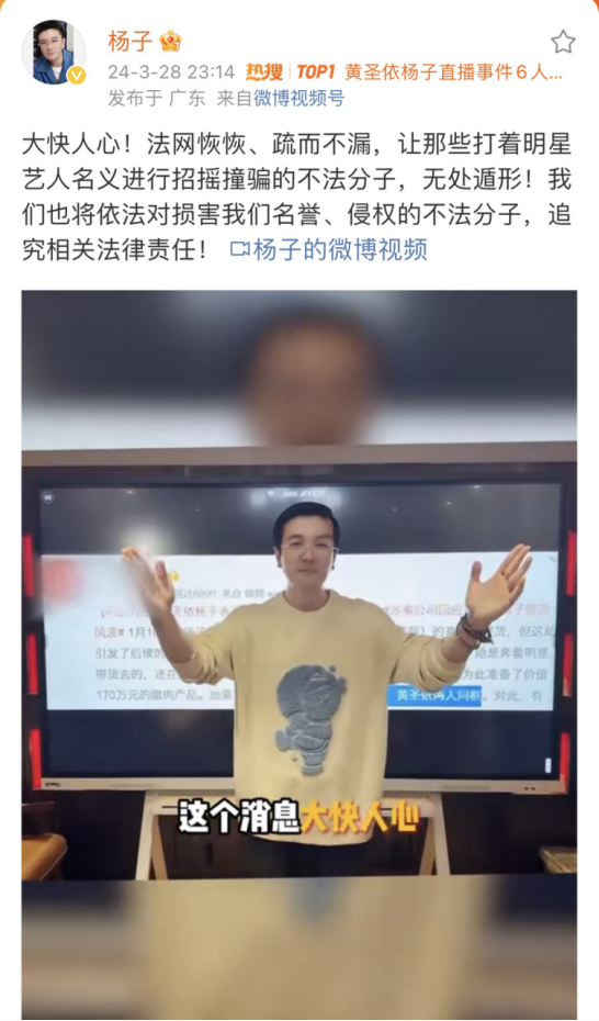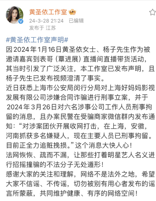 黄圣依、杨子此前声明与自己无关的“腊肉直播事件”有新进展。 3月28日晚,黄圣依工作室在微博发布声明,声明中提到:近日获悉上海市公安局闵行分局对上海好妈妈影视发展有限公司涉嫌合同诈骗进行刑事立案,并于2024年3月26日对6名涉事公司工作人员刑事拘留的消息,且办案民警在受骗商家微信群内发布通知:“对涉案团伙开展收网打击,在上海、安徽、河南抓获多名嫌疑人,现在主要人员已刑事拘留。目前正全力追赃挽损。” 黄圣依对此还表达了“大快人心”!